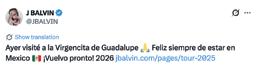 video difundido en sus redes sociales, J Balvin compartió parte de su experiencia y expresó su cariño por el país. “Ayer visité a la Virgencita de Guadalupe. Feliz siempre de estar en México”, escribió, además de confirmar su regreso en 2026 como parte de su gira internacional.