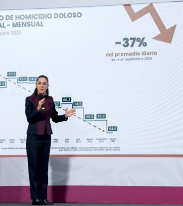 La presidenta resaltó una reducción del 37% en el promedio diario de homicidios dolosos medido entre septiembre de 2024 y octubre de 2025. El númro pasó de 86.9 a 54.5 víctimas por cada día.