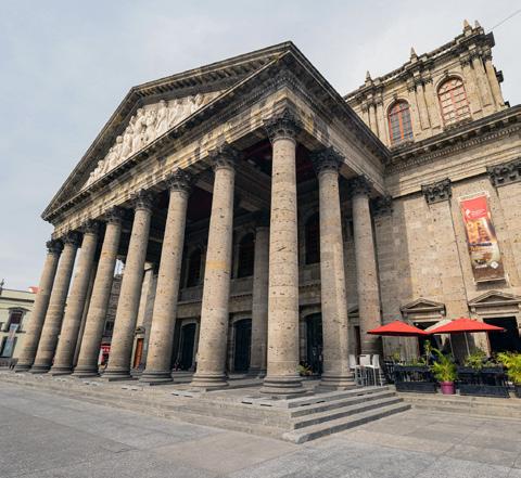 К Teatro Degollado. Joya neoclásica del siglo XIX, con su fachada de columnas corintias y frescos que evocan la Divina Comedia.
