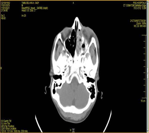 resolution of the acute infection which has resulted in the cessation of pus discharge and tenderness without resolution of chronic osteomyelitis (Fig 10). The patient reported with intraoral wound dehiscence one month postoperatively exposing underlying necrotic bone (Fig 11). The intraoral wound has since then been managed with regular application of a gauze pack impregnated with Bismuth-Iodoform-Paraffin Paste (BIPP). A second debridement was also carried out three months postoperatively to remove the newly formed necrotic bone but there has been recurrent necrosis of the healthy bone that was exposed upon debridement once again. Secondary healing of the intraoral wound by the formation of granulation tissue has not occurred as the underlying bone is necrotic in nature. The patient has currently been advised to remain under follow-up and maintain strict oral hygiene measures along with the regular application of BIPP-impregnated gauze to facilitate healing as best as possible.