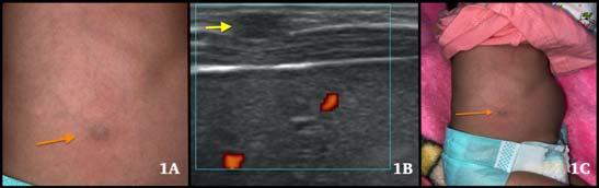 visualize better superficial blood vessels arranged in a telangiectatic pattern draining to the venous malformation (orange arrow in Fig 1A & C). Fig 1B is a Doppler Ultrasound of the nodule, suggesting a slow flow pattern of the vascular malformation and no communication with arterial circulation (the yellow arrow points towards the vascular malformation)