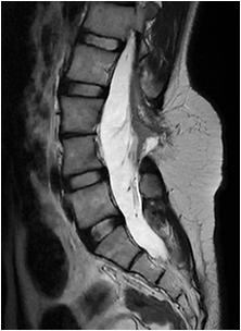 (2)Spinal dysraphism can be broadly divided into open spinal dysraphism and closed spinal dysraphism. In open spinal dysraphism, the cord and its covering are exposed and there is no overlying skin. These include myelomeningocele, myelocele etc. In closed spinal dysraphism, the cord is covered by normal mesenchymal elements. These include lipomyelomeningocele, lipomyelocele, meningocele,isolated spina bifida, intradural lipoma, dorsal dermal sinus, diastematomyelia etc.