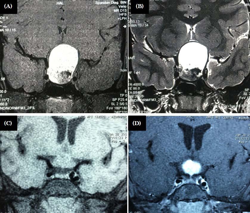 Fig 2 — Upper panel: MRI of patients with craniopharyngioma. Mixed solid-cystic lesion with cystic component being hyperintense in both T1 (A) and T2 (B) weighted sequences