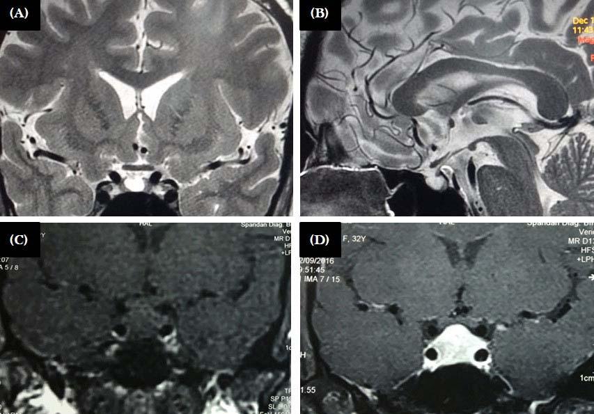 Hypophysitis was diagnosed based on the radiological score proposed by Gutenberg et. al. that showed a sensitivity of 92%, a specificity of 99%, a positive predictive value of 97%, and a negative predictive value of 97% for the diagnosis of autoimmune hypophysitis11. All such patients underwent routine cerebrospinal fluid (CSF) analysis, and estimation of adenosine deaminase (ADA), angiotensin-converting enzyme (ACE), β -human chorionic gonadotropin (hCG) and α-fetoprotein (AFP) in CSF in addition to measurement of serum immunoglobulin G4 (IgG4) level. Idiopathic intracranial hypertension (IIH) was suspected in presence of empty sella (ES), dilated optic nerve sheaths, protrusion of optic nerve papilla into the posterior globes, and compressed ventricles and CSF cisterns on MRI 12