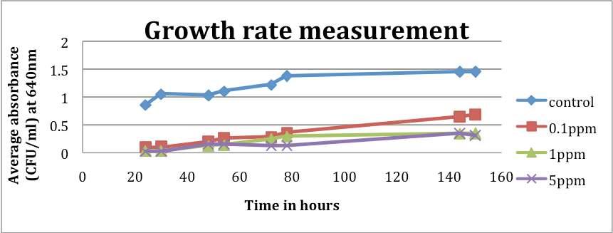 0.633mean absorbance at 640nm). From the next day the optical density of treatments were measured by M350 spectrophotometerin1mlcuvettesat640nmwavelength. Thedensitywasmeasuredwithrespecttoacuvettewith1 ml of sterile water as a blank. Two readings were taken everydayattwotimesatanintervalof6hours.Aftereach reading the flasks were kept at 25°C in the dark in the shaker. From the next day of inoculation the measurements were taken for 6 days. The growth curves were obtained by plotting the optical density against time inMS-Excel.