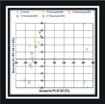 Fig 5 : PCAscore plot differentiating between plain MEA(blank),A. fumigatus growing on plain MEA(control) and ED50 and ED90 of benomyl and tebuconazole treatments after 96 hours [Upper left picture]. CAof blank,A. fumigatus growing as control and against ED50 and ED90 of benomyl and tebuconazole treatments after 96 hours. (Key: B – benomyl and T –tebuconazole) [Upper right picture]