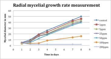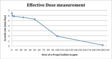 (c) Experiment withAntioxidant: Stock solution of nPropyl Gallate was mixed with molten MEA and used at sixdifferentconcentrations(1.0,5.0,25.0,50.0,100.0and 200.0 ppm) against growing colonies of Aspergillus and fivedifferentconcentrations(1.0,5.0,25.0,50.0and100.0 ppm) against Candida. For benomyl and tebuconazole the othermethodsweresameasdescribedprimarily.