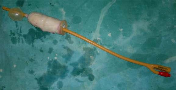 Following admission to our medical college, a provisional diagnosisofTransverseVaginalseptumwithvaginalatresiawas made & she underwent operation for the 3rd time on 26-2-2012. Her HIV screening was negative. Keeping Foley's catheter in bladderandurethra,andexertingtractiononcatheter,probingof thick vaginal septum is done by stillet of IV cannula. Once the sac of haematocolpos is reached, a verres needle followed by gradually increasing size of Hegars dilator upto size no. 8 is introduced in the same tract towards posterosuperior direction, keeping a finger guide at rectum. A 14 Fr Foley's catheter is placed in the sac of haematocolpos and a continuous catheter drainageofaccumulatedbloodisallowedfor4days(Fig2).The vagina was atretic and dissection was done in the loose areolar space between the bladder and rectum towards the cervix and vaginalseptalexcisionandvaginoplastywascarriedoutkeeping the Foley's catheter in situ. A 20ml syringe half cut out on nozzle-side, which is gauze and condom wrapped, over which amnion graft is placed and through inner side of syringe the Foley'scatheterispassedandthismouldstructureisplacedinthe neo-vagina (Fig 3), and kept for 7 days. A follow up USG was done for re-evaluation (Fig 4). The mould is removed after 7 days when amnion graft is taken up but the Foley's