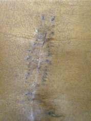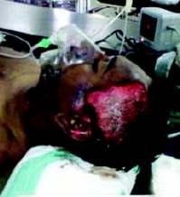 thresher machine his neck cloth got entangled. He was alone at the moment, and the pulling force of the thresher hit him hard against the rotating machine and avulsed his scalp and hair from the head before helping hands arrived. He was rescued but sufferedfrommutilatingandghastlyscalpavulsion.(Fig2).
