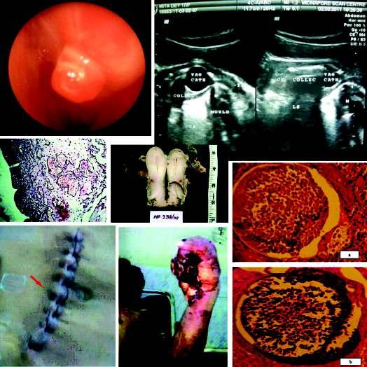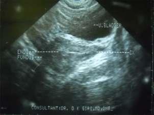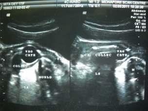 MissMDaged16yearsoldunmarriedgirlwasreferredfrom a subdivision hospital on 10.2.2011 with a hypogastric mass of 14 weeks size with well developed secondary sexual character Speculam examination revealed, a blind short vagina of 1 cm depth. On per rectal examination, a soft, globular mass at pouch of douglas, with overlying free rectal mucosa. She had normal complete haemogram, blood sugar, urea, chest x-ray and ECG report. She gives history of drainage of haematocolpos on 10-82010, at private nursing home without any prior USG report. Followingdrainageshedidnotmenstruateinthenextcycle.She visited gynaecologist of subdivision hospital and advised USG (2-11-2010)whichshows(Fig1),mildcollectionatendometrial cavity and huge thick collection in distended endocervical canal suggestive of mild haematometra & large haematocolpos but bothovaries&kidneyswerenormal.Sheunderwentre-drainage thereanddischarged10daysafterthedrainagebutunfortunately shedoesnotmenstruateinthenextcycle.