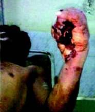 A sugar factory daily wedge labourer was feeding raw material in a cane crushing machine. He was distracted for a minute and his loose neck cloth got entangled in the rotating machine part along with sugarcanes and rotating momentum of the machine stopped only after severely crushing both his forearms. His life was saved but he underwent bilateral fore-arm amputation leaving him devoidofbothhisforearmsforlife(Fig3).
