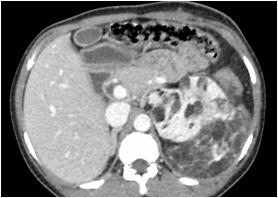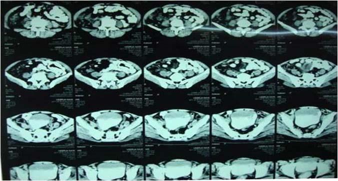 (1)Innumerable varying sized fat density lesions with enhancing soft tissue density areas are seen in both kidneys suggestive of Angiomyolipomas.