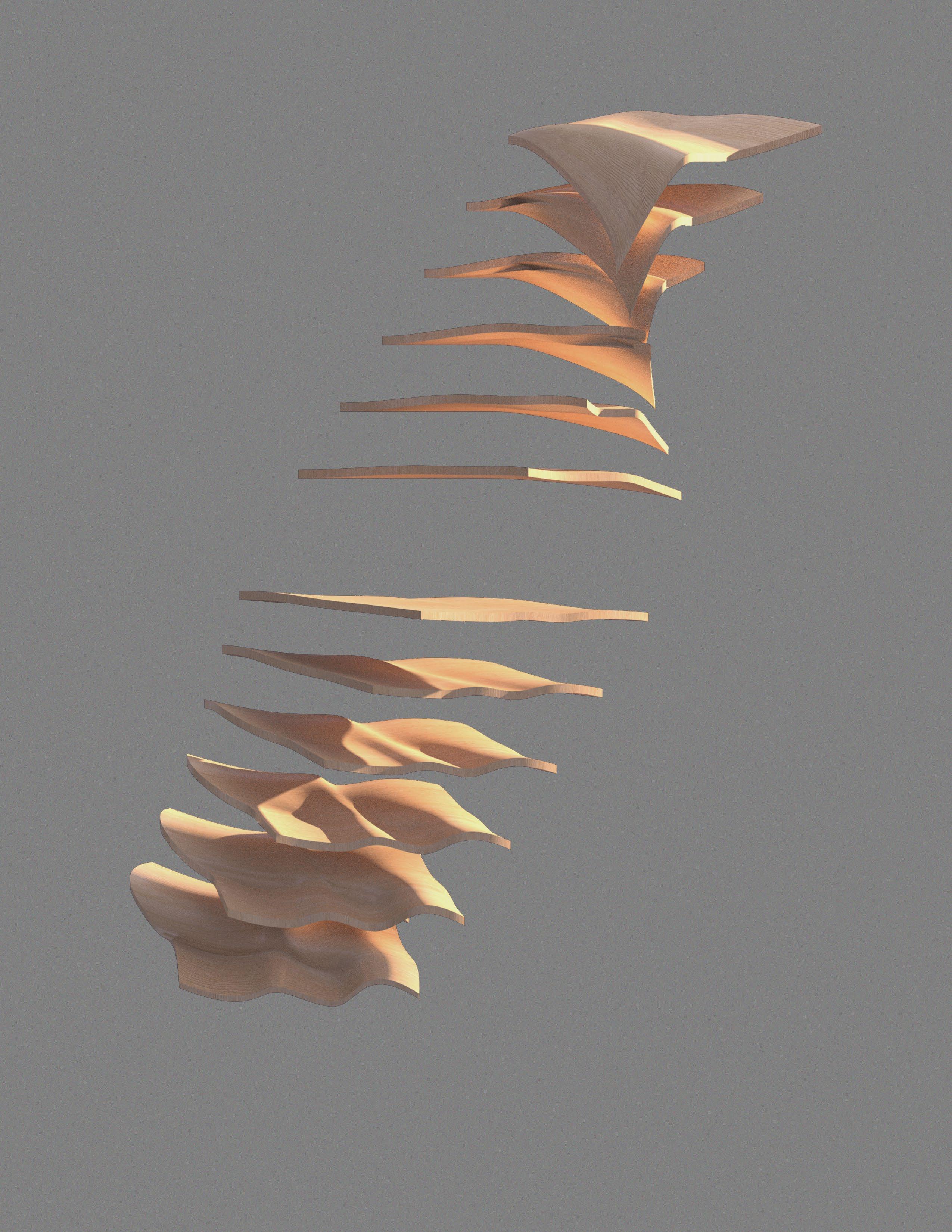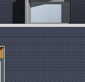 Exterior material finishes reinforce the natural layering concept. Glazing is prominent to allow views inside and out. Upper floors and soffits are clad in copper paneling. Lower floor facade materials consist of brick. A grasshopper script is used to offset the bricks into a wavy, textured pattern, providing more visual depth, as if naturally eroded.