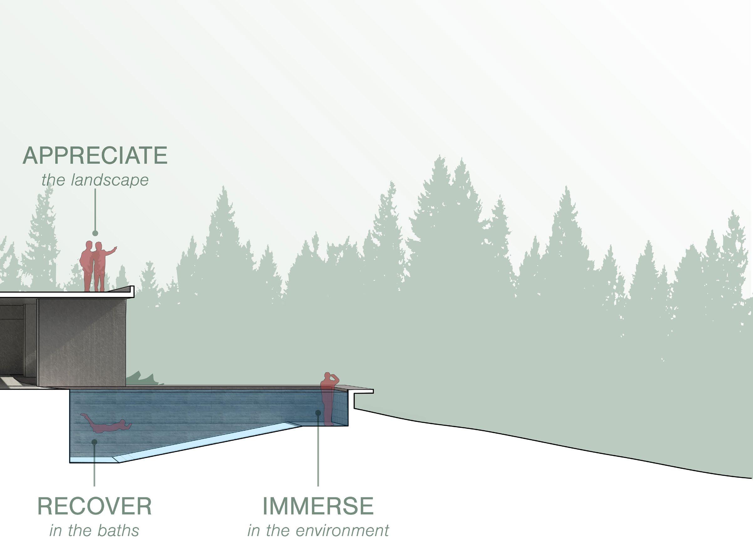 Below ground, users are sheltered from the elements. Weary travelers progress through the building, touching the cool granite floors while listening to the sounds of running water. The terminus of the journey results in a sensory immersion within nature. At the far end of the tepedarium, long traveled visitors stand in the warm water, breathe in the cool air, and are surrounded by the sounds of the forest.