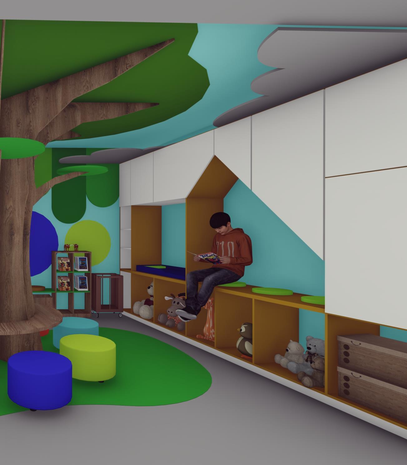 Aula de infantes de una escuela de niños dominical , realizada que propone áreas lúdicas, de estudio, arte y limpieza. Propue