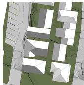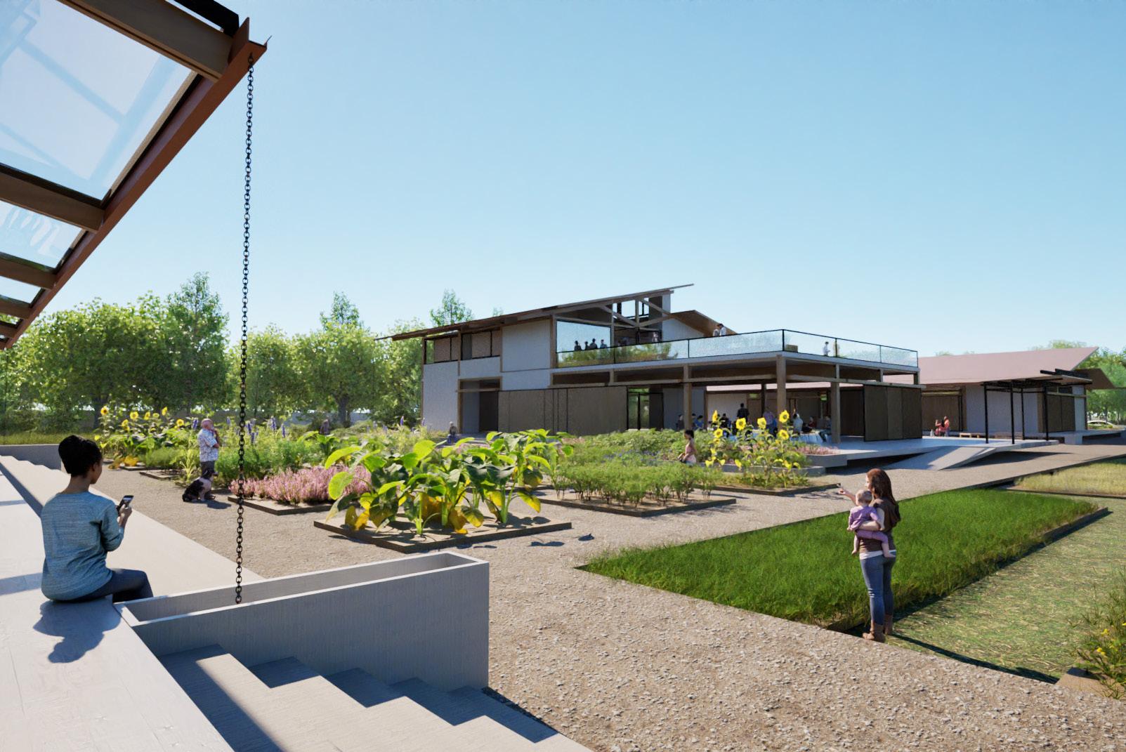daylighting and cooling, as well as solar exposure. The four concrete platforms sit just above the ground plane creating landscape pockets for bio-diverse planting, therefore reserving the open soil for cultivation. The building forms are inspired by rural vernacular architecture. Users can experience varying degrees of enclosure with the operable envelope that surrounds the buildings, allowing for air circulation and a visual connection to the surrounding landscape.