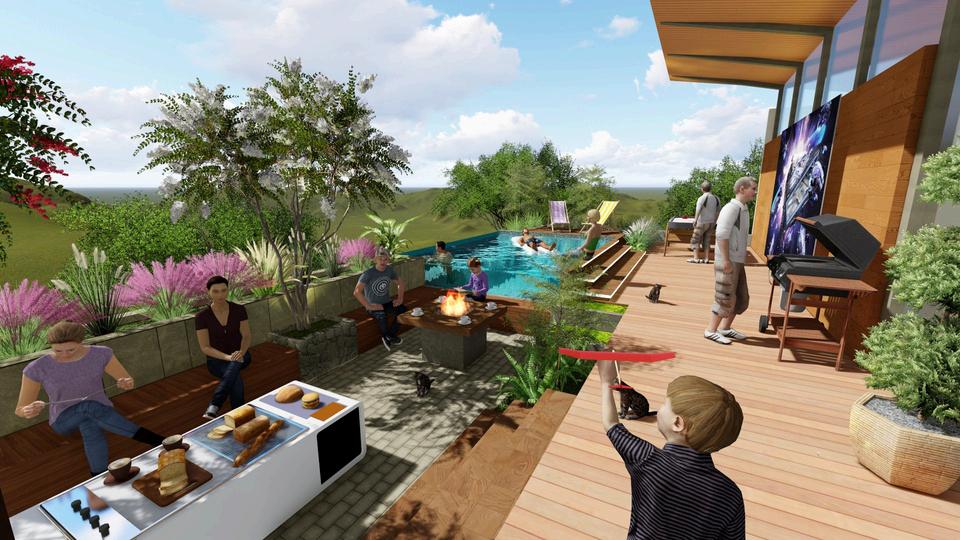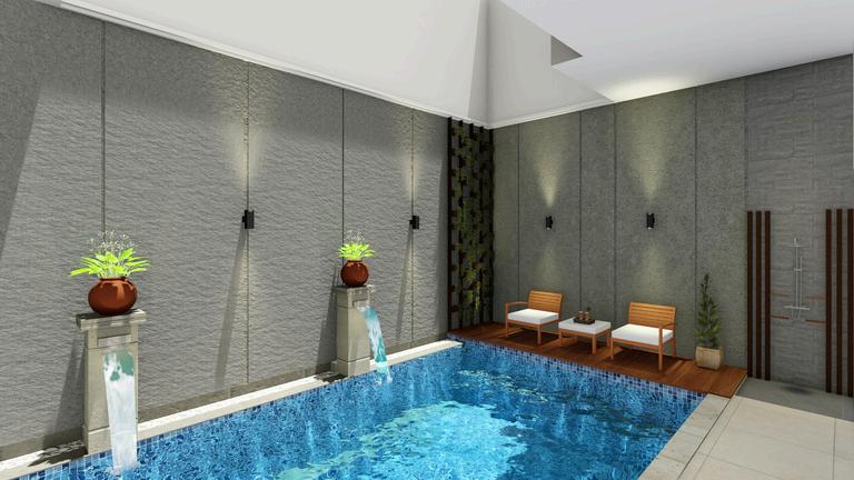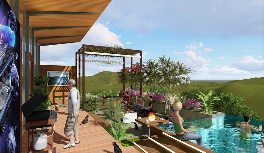 Konsep desain taman dibagi dalam 2 fungsi yaitu sebagai area bersantai dan area infinity/playing pool. Desain area duduk/santai dibuat dengan konsep multifungsi untuk berbagai aktifitas serta penggunaan unsur material alam menciptakan suasana tropis.
