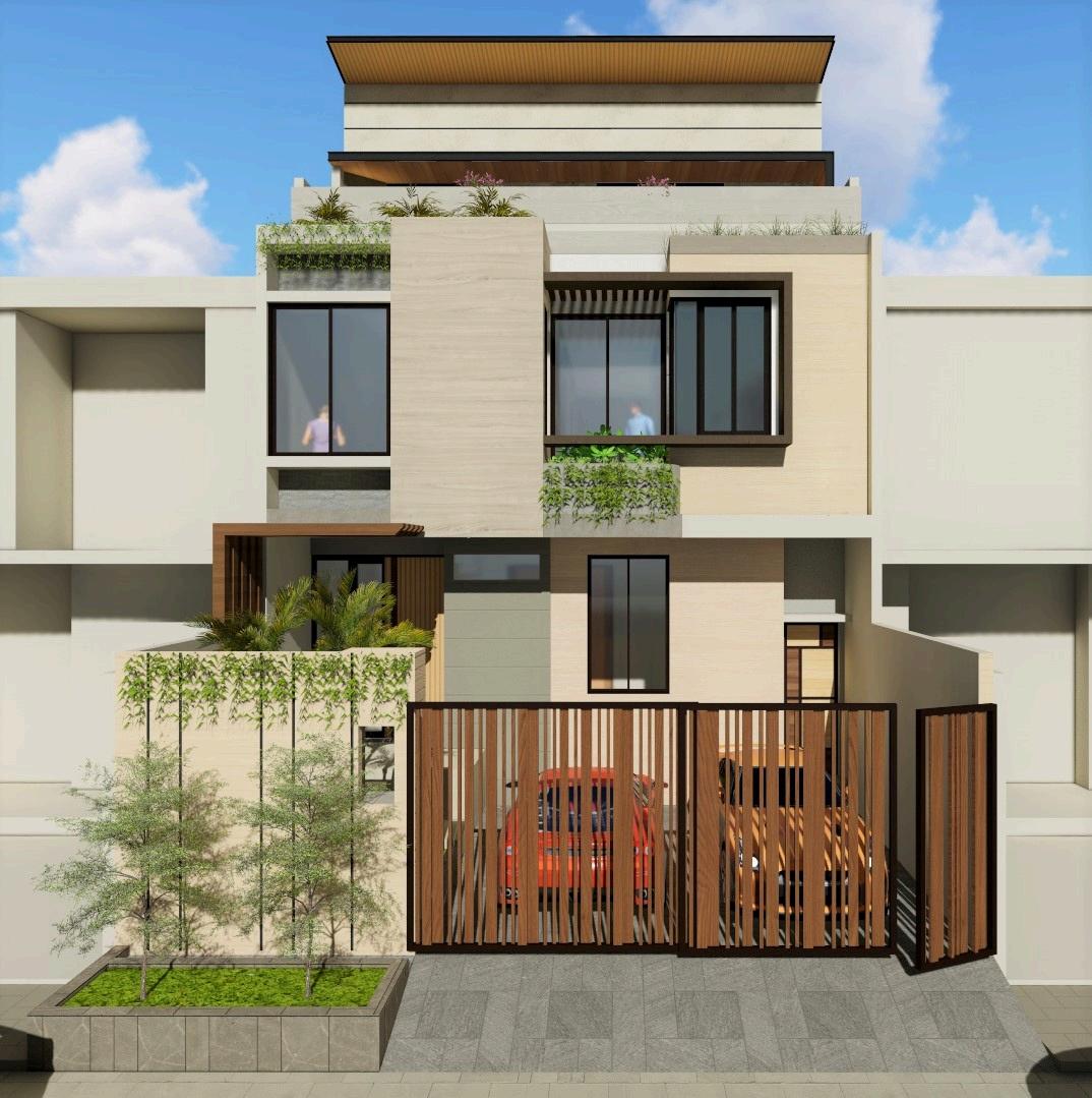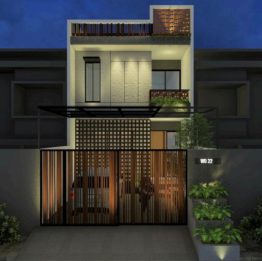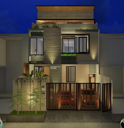 Fasad rumah didesain dengan konsep tropis minimalismelaluipenggunaanrosterdankisi-kisi dengan warna kayu & batu alam yang dipadukan sebagai estetika. Pengaplikasian void pada ruang dalam bertujuan untuk memaksimalkan pencahayaan dan sirkulasi udara keseluruhan ruang dalam rumah, serta memberikan kesan ruangyanglega&luas.