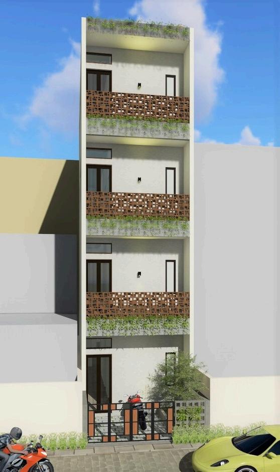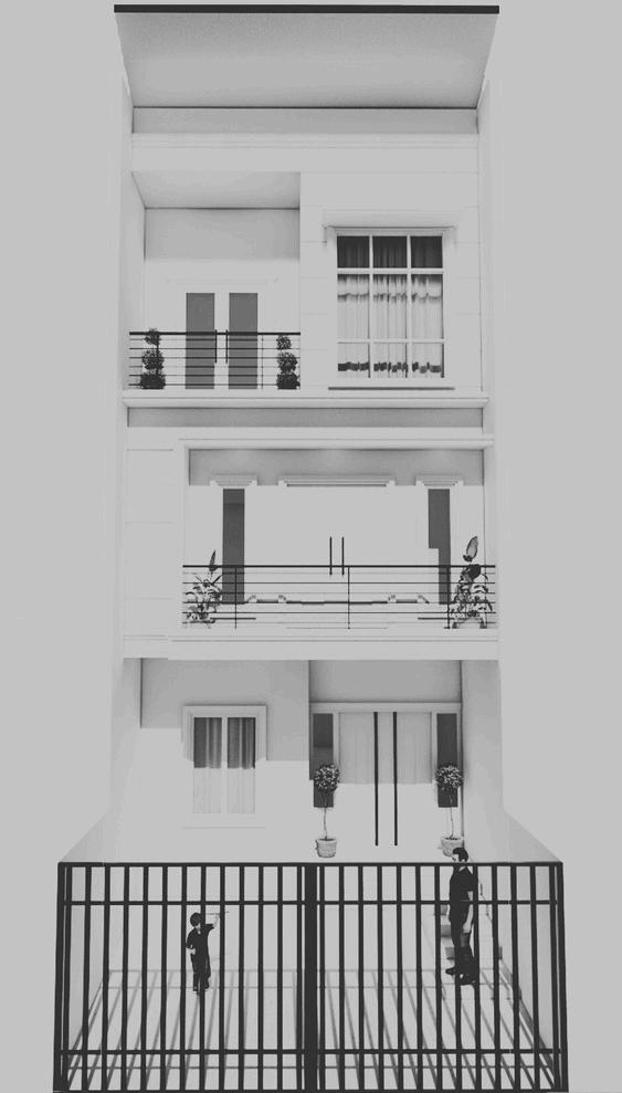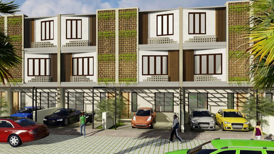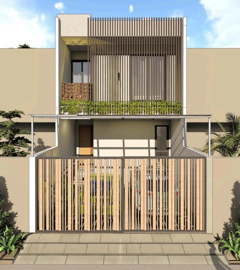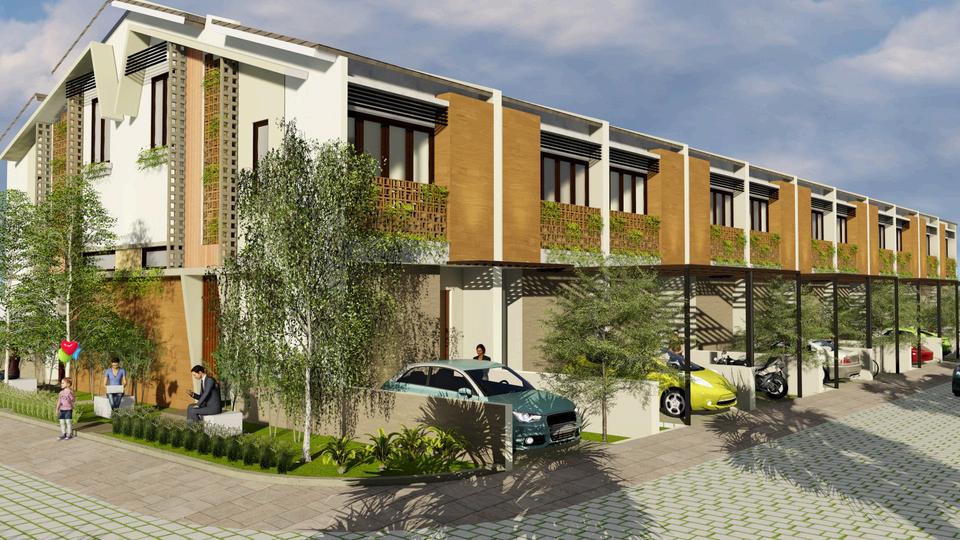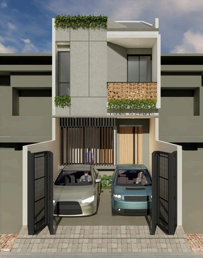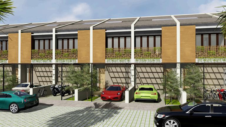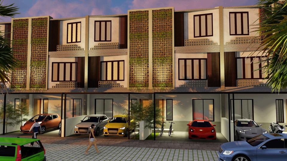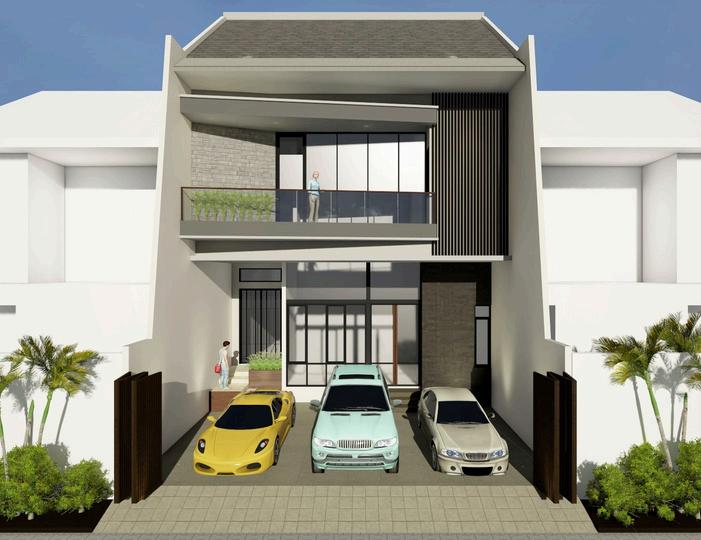 Desain keseluruhan bangunan mengambil tema modern minimalis yang terlihat melalui permainan garis dengan aksen miring pada fasad balkonrumah.