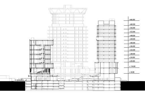 Core Bangunan menjadi tumpuan balok-balok tiap lantainya. Struktur gantung meminimalkan ruang yang terbuang akibat kolom dan juga mengurangiresikogagalnyastrukturakibatrembesanairlaut.