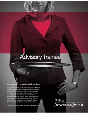 2009 serverar vi en smakstart på karriären Öhrlings PricewaterhouseCoopers har genom Advisory Trainee Program skapat en unik tjänst inom finansiell rådgivning och Corporate Finance. Vi har tagit fram ett program som ger dig förutsättningarna att bli en framgångsrik specialist inom vår bransch och en framtida ledare i vårt företag. Det är inte en räkmacka eller genväg som serveras, tvärtom, vi ger dig förutsättningarna att lyckas, men det är upp till dig att förvalta möjligheten. Vi litar på att du klarar det. För mer information; besök www.pwc.com/se/student