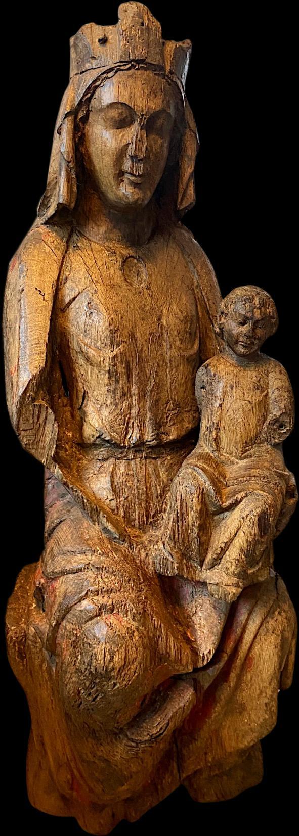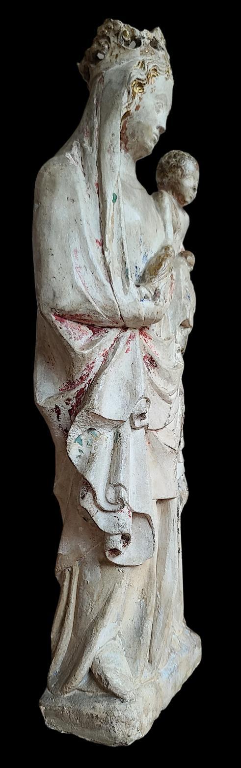 Mary holds Christ on her left knee. Hieratic face of the Virgin, still very much borrowed from Romanesque canons, framed by a short headdress. Our sculpture is distinguished by its important museum dimension and the confrontation of the two characters, the hieratic Virgin and the Child, already belonging to the first Gothic of Île-de-France. The very beautiful face of the Child, the short headdress of the Virgin, her mantle with remains of red polychrome, pulled under the arm, are all characteristics of this period of transition between Romanesque art and early Gothic art.