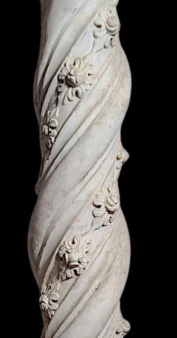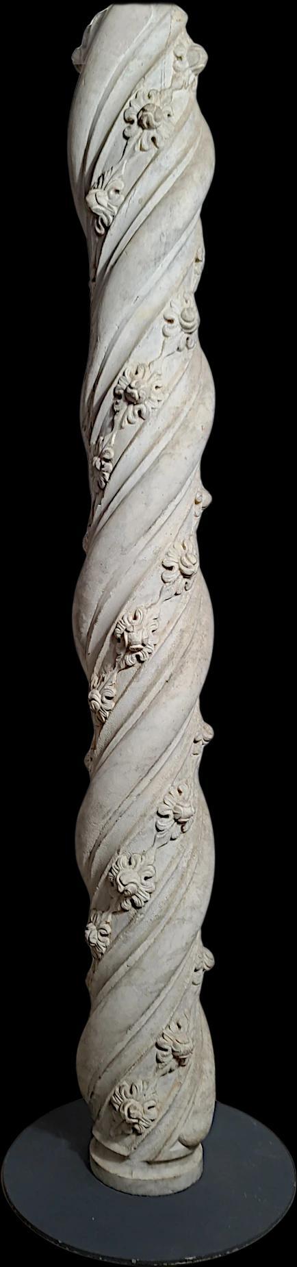 Significant twisted column in white marble. A helical band, chiseled between two lateral bands, alternates with a spiral of fleurons. This column most likely originates from a cloister or portal and finds parallels in central Italy. Such magnificence is notably observed in Tuscany, Lazio, and Umbria during the 13th and 14th centuries. However, our column is distinguished from 14th-century works by a more rectilinear profile and a greater sobriety in its floral motifs, contrasting with the opulence of the columns from the portal of Orvieto Cathedral (14th century). These characteristics allow us to date this piece to the last third of the 13th century.