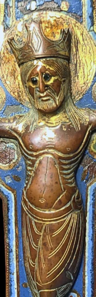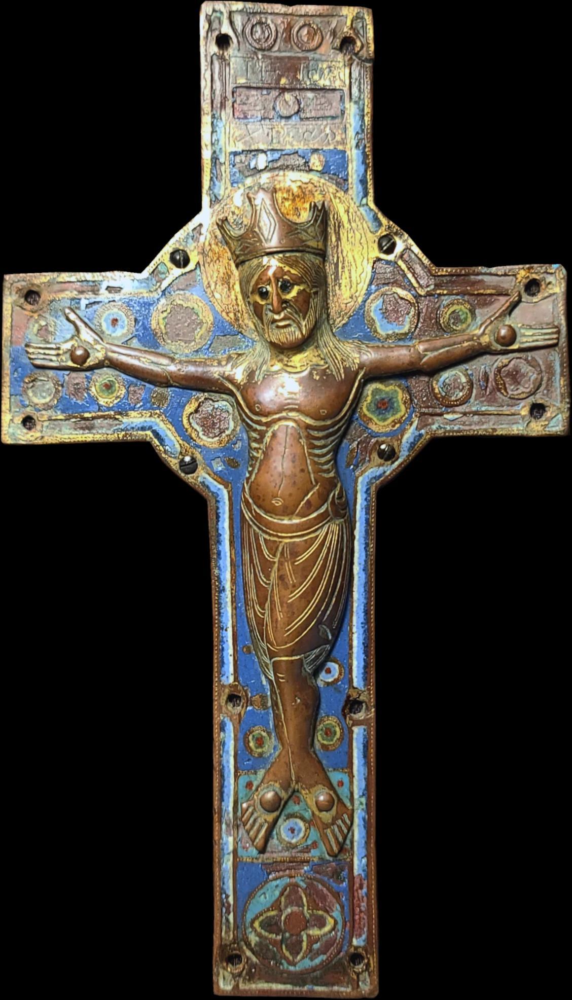 Large central plaque of a cross featuring Corpus Christi in enamelled and gilded champlevé copper. Christ is depicted crowned and haloed, with the crown decorated with diamonds and the eyes inlaid with glass beads.