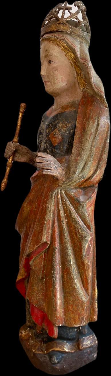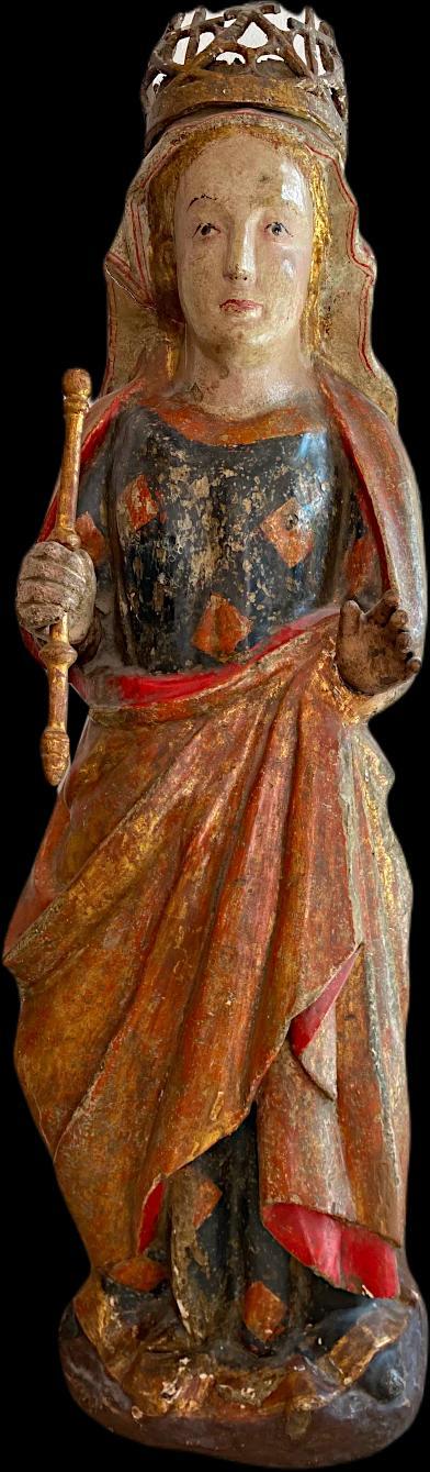 The Virgin holds a scepter in her right hand, symbolizing her role as Queen of Heaven. While the crown she wears is old, it is likely a later addition, enhancing the sculpture's regal appearance and emphasizing its devotional purpose. The dynamic drapery, subtle expression, and meticulous detailing highlight the sculptor’s skill and the cultural importance of Marian devotion during the period. Its preservation, regional motifs, and elegance make it an outstanding work of Gothic art from Catalonia.