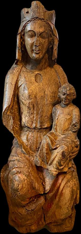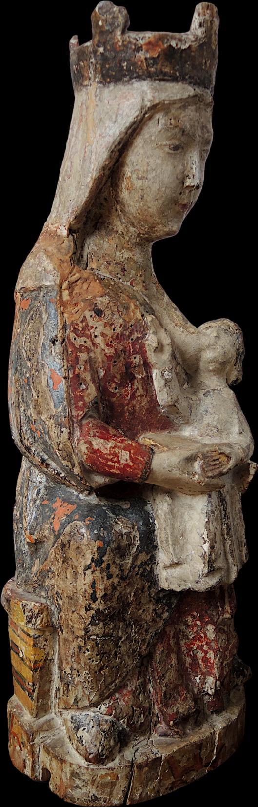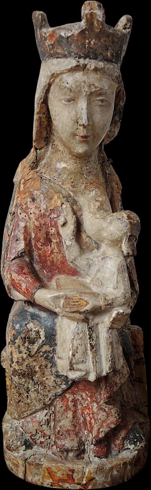 Before the discovery of this piece, only three medieval nursing Madonnas were documented in the Pyrénées-Orientales, making this work an invaluable addition to the corpus of Gothic religious art. Mary is portrayed seated on a throne, exuding a gentle yet enigmatic expression that invites contemplation.