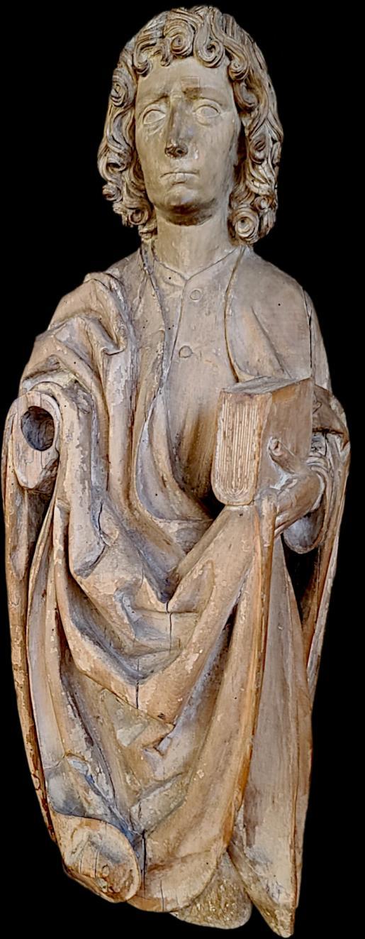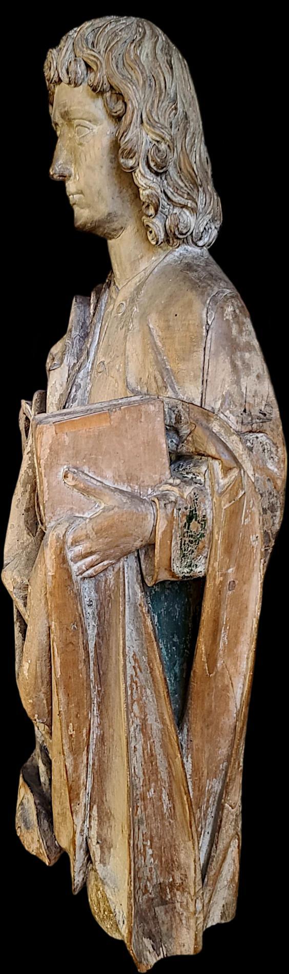 Ulm, late 15th century. This Gothic sculpture depicts Saint John the Evangelist and is distinguished by the finesse of its details, particularly in the treatment of the ample and fluid drapery, as well as the wavy, curly hair of the saint—characteristic of the late Gothic style. Saint John is shown holding a book, symbolizing his Gospel. His face, with delicate and meditative features, slightly idealized, reflects profound spirituality.This work, attributed to the Master of the Acker Altar (Meister des Acker-Altars), was exhibited at the Ulm Museum and bears an inventory number on its back corresponding to its loan. The sculpture showcases the distinctive characteristics of this Master's chisel, including finely hollowedout hair and a serene expression, contrasting with the austerity seen in the works of his contemporaries, Veit Stoss and Tilman Riemenschneider.