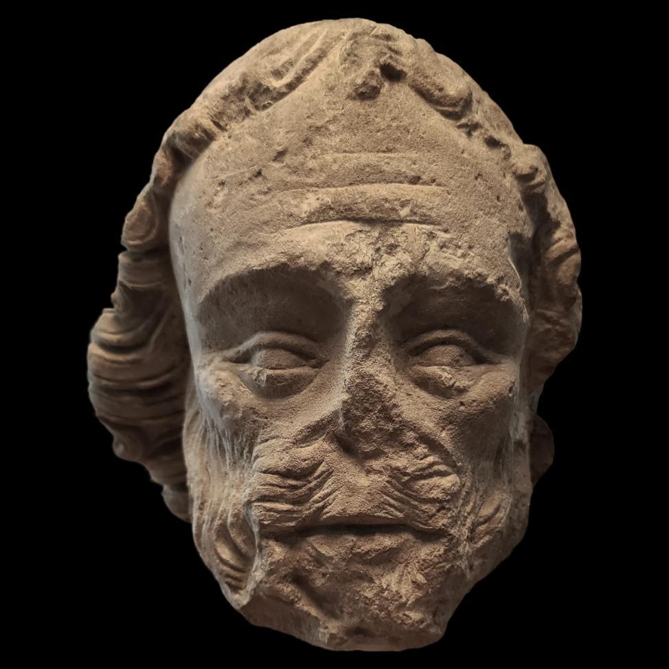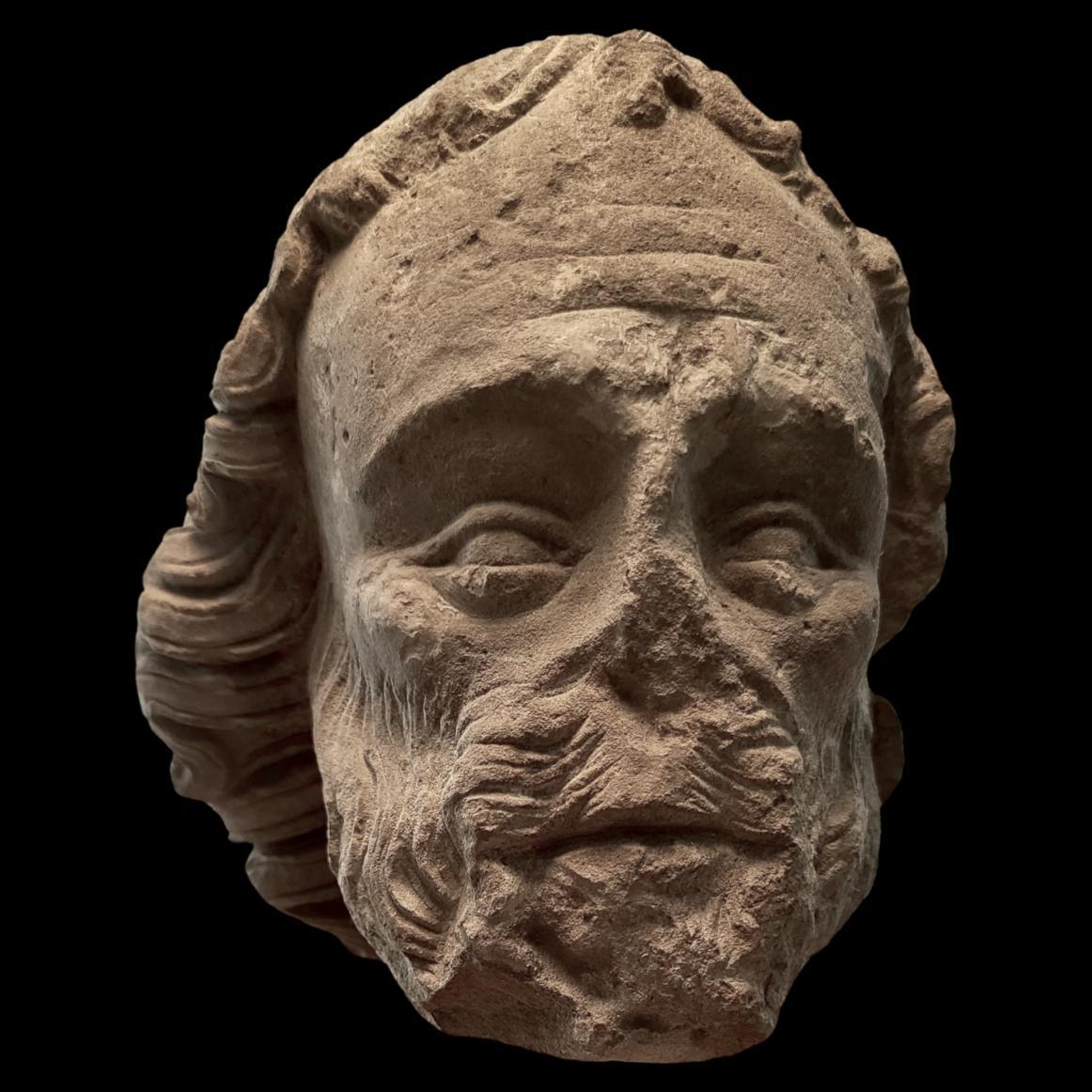 Head of an apostle from Parisian workshops, second half of the 13th century. The saint is portrayed as mature, with well-defined facial features, including marked cheekbones and deeply incised lines that convey a sense of age and wisdom. The beard and mustache fall into fine, well-delineated strands, while the hair is sculpted in thicker, undulating locks.