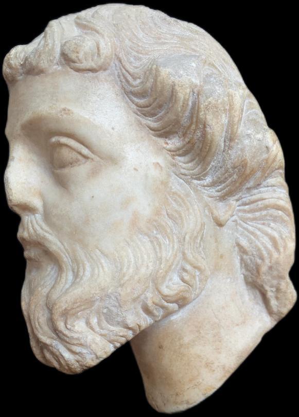 The beard and flowing hair are intricately carved with delicate, rhythmic curves, showcasing a mastery of detail and naturalism.