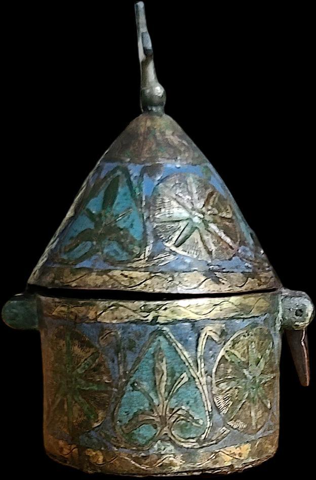 This Gothic pyxis, originating from the renowned workshops of Limoges in the mid-13th century, exemplifies the exceptional craftsmanship and artistry associated with this region. Fashioned in enamelled, engraved, chased, and gilded champlevé copper, the pyxis features a harmonious blend of vivid blue, green, and turquoise enamels, accentuated by intricate gilded motifs.