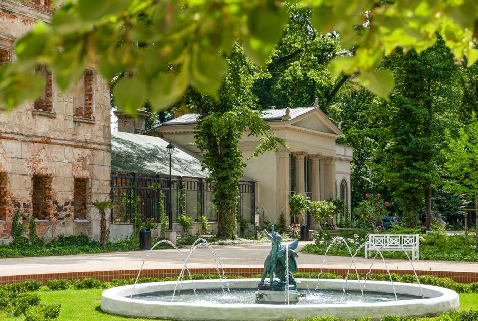 możesz podziwiać odrestaurowane elementy architektury ogrodowej oraz odpocząć wśród zieleni. Na terenie dawnej oranżerii pałacu znajduje się kawiarnia Café Orangerie, w której możesz napić się pysznej kawy oraz zjeść coś słodkiego w pięknym, pełnym historycznych detali wnętrzu.