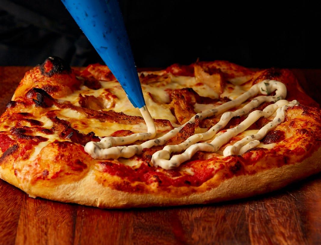 2. Bag pizzaerne på en pizzasten i ca. 4 minutter, vend den en halv omgang og bag den i et par minutter mere, indtil den er jævnt bagt. Tag den ud og lad den køle af i et par minutter, før du tilsætter jalapenomayo og ca. 40 g syltede rødløg. Skær pizzaen med en pizzaskærer og server straks.