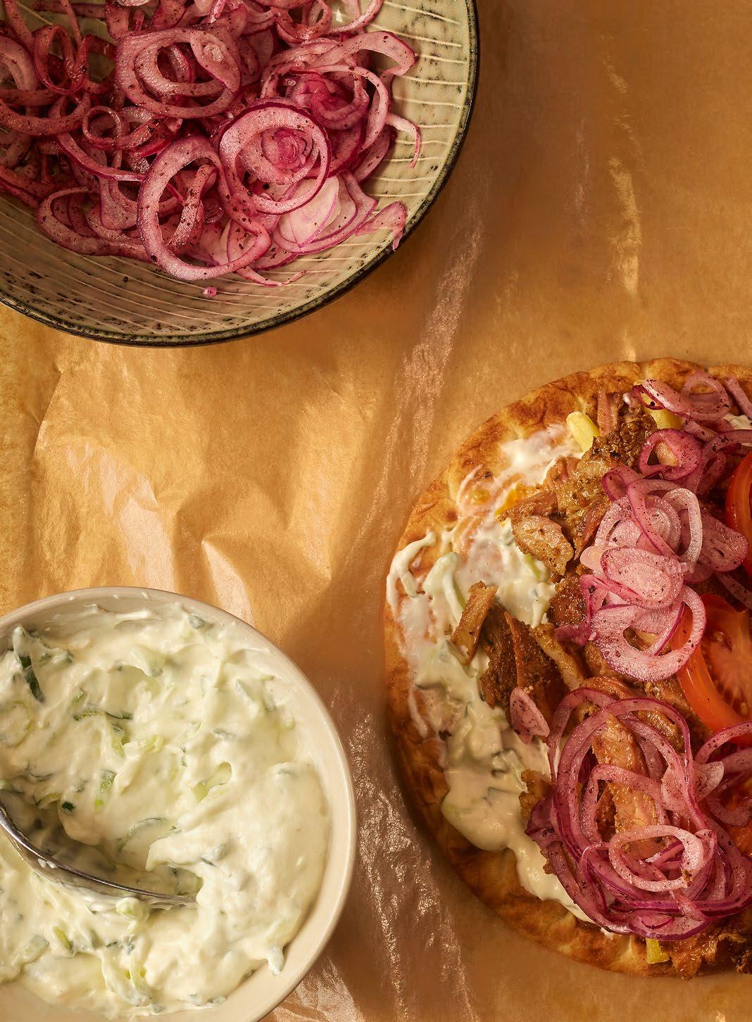 Tilbered pommes frites og skær kødet tyndt fra spyddet. Læg tzatziki, kød og pommes frites på gyrosbrødet og top med tomat og syltede løg.