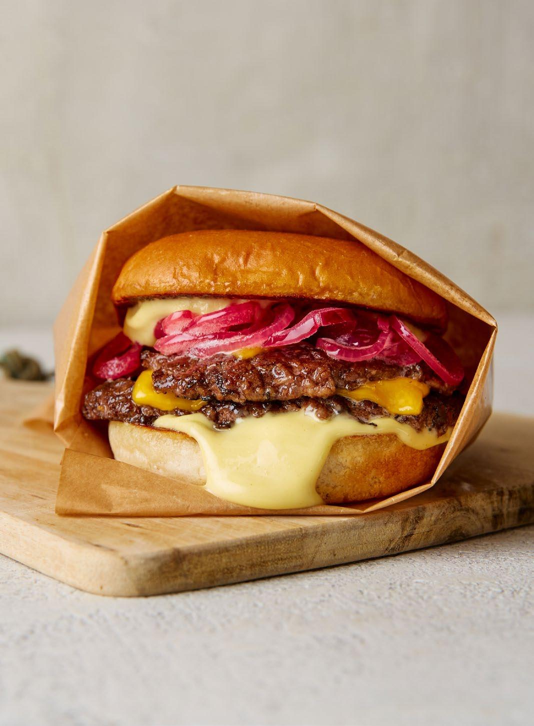2. Del burgerbollerne og rist den skårne overflade i fedtstof. Pres kødet fladt på en varm grillplade eller pande med bagepapir og en vægt (f.eks. en gryde eller stor spatel), krydr med salt og peber. Vend burgere og krydr igen og top med cheddar og 1 spsk Dijon-mayonnaise. Læg to burgere oven på hinanden og top dem med syltede løg og placer dem i burgerbollen.