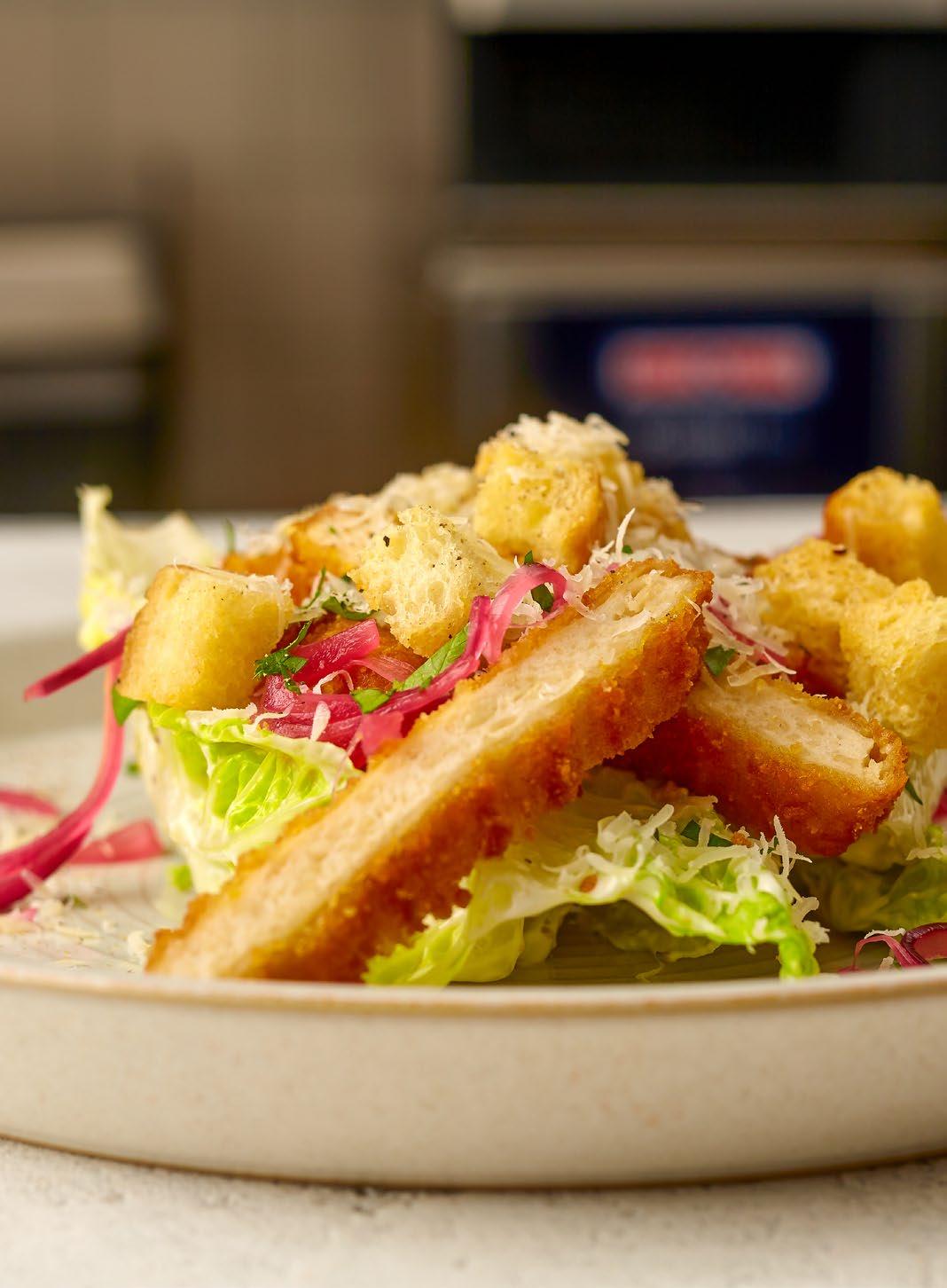 2. Riv salaten i grove stykker. Bland dressingen i en blender og dressér salaten. Anret på tallerkener og top salaten med rødløg, Crispy NoChicken Burger skåret i mindre stykker og revet parmesan.