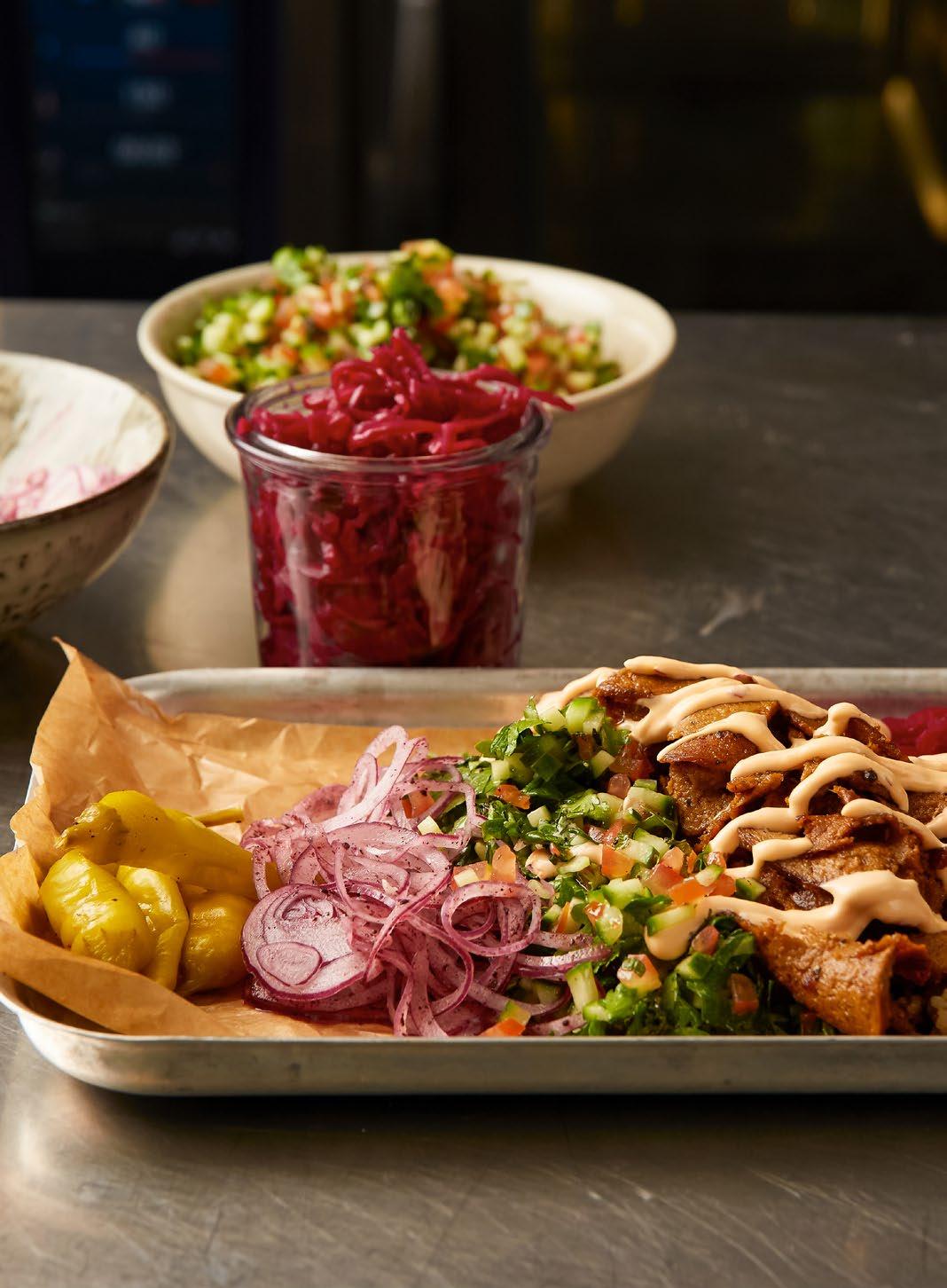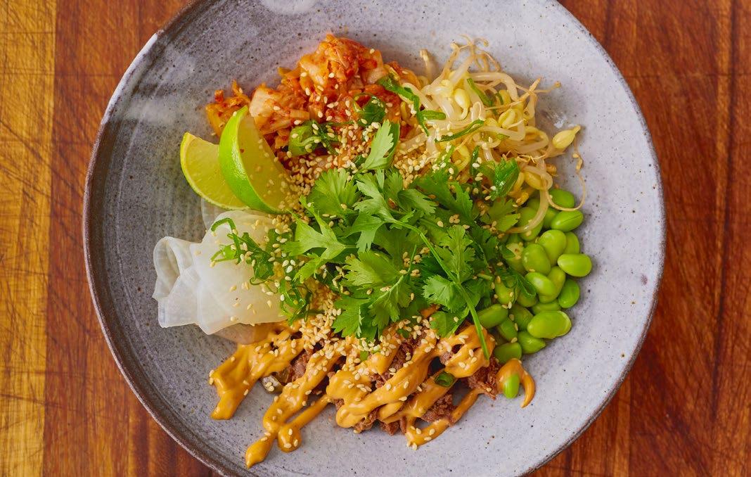 En must-try sund og lækker grain bowl fyldt med syltede grøntsager, kimchi-gulerødder, marinerede kikærter, sprødt protein og vegansk cremethed.