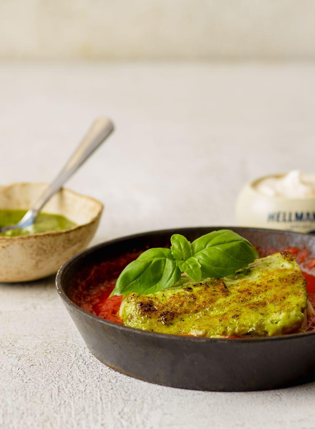 2. Læg fiskestykkerne i en let olieret bageform. Bland 400 g Hellmann’s Vegan med 150 g pesto og dæk fisken med blandingen. Bag i ovnen ved 160°C i cirka 15 minutter.