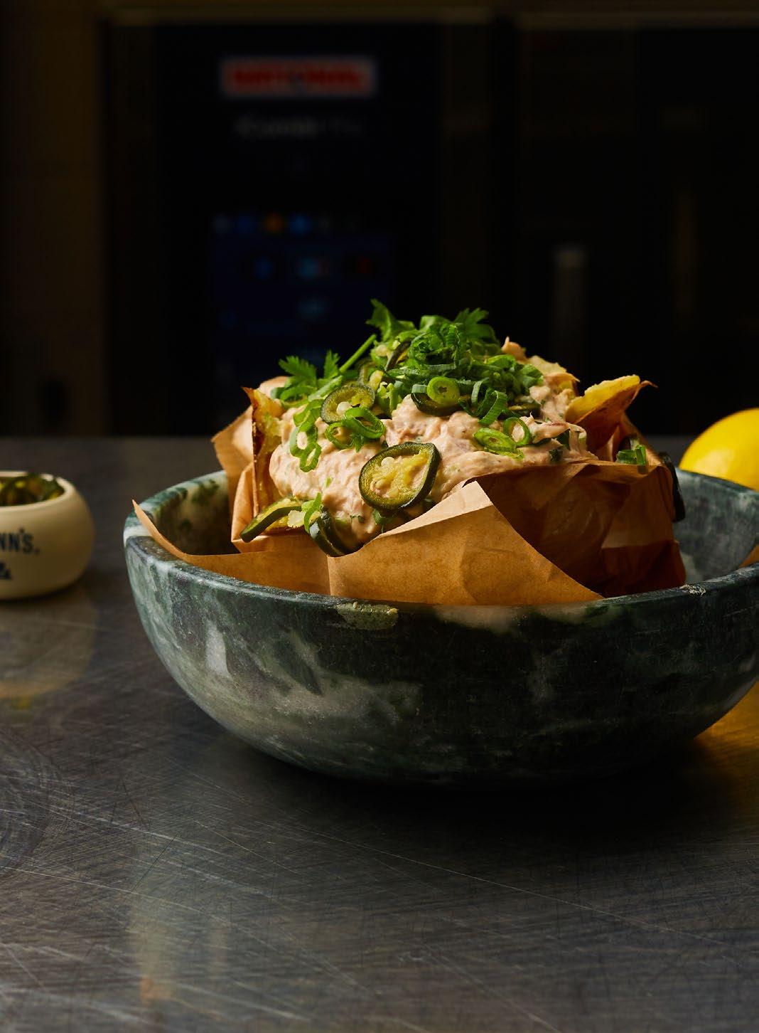 2. Dræn tunen for overskydende olie og bland den med Hellmann’s Professional, jalapeno, koriander, sriracha og forårsløg og smag til med salt og citronsaft. Lad tunblandingen hvile i 1 time.