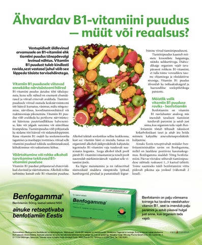 Benfotiamiin on vitamiin B1 rasvlahustuv analoog, mis imendub tavalisest tiamiinist tunduvalt paremini ja satub just sinna, kus organism teda vajab. Benfotiamiin tõstab tõhusalt rakusisest kokarboksülaasi taset ja aitab ära hoida Alkohol tekitab soolestikus sellise keskkonna, mitmete kahjulike ainevahetusproduktide kust see vitamiin hästi ei imendu. Samas on kuhjumise. Ainuke Eestis retseptivabalt müüdav benorganismil alkoholi jääkproduktide kahjutuks tegemiseks B1-vitamiini vaja tunduvalt suu- fotiamiinisisaldav ravim on Benfogamma, remates kogustes. Seega alkohol ühelt poolt millel on laialdane positiivne kasutuskogepärsib B1-vitamiini omastamist ja teiselt poolt mus. Benfogamma sisaldab 50mg benfotiasuurendab märkimisväärselt vajadust selle vi- miini. Päevas võetakse sõltuvalt tiamiinipuuduse nähtude raskusest 1...3 kaetud tabletti. tamiini järele. Ka liigne maiustamine ja nn rafineeritud Toime saamiseks tuleb benfotiamiini võtta süsivesikuid sisaldava rämpstoidu (pitsad, pidevalt pikema aja jooksul (vähemalt 2 hamburgerid, pirukad ja pastatoidud) liigtar- kuud).