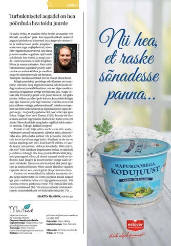 gerli.aasmaa@ekspressmeedia.ee, tel 5880 3319 Kujundaja: Marju Viliberg Keeletoimetaja: Riina Palmiste Väljaandja: AS Ekspress Meedia Trükk: AS Printall