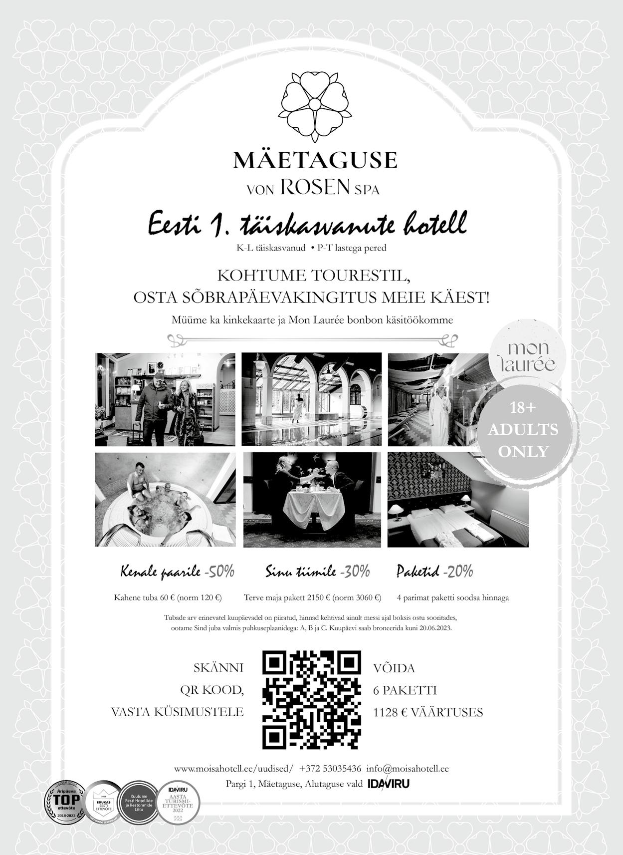 „Pimedal ja külmal ajal mõtlevad inimesed tihti soojusest ja valgusest ning nii on alati hinnas olnud head spaapakkumised. Spaapuhkuse armastajad leiavad tänavu Tourestilt juba häid vanu tuttavaid, nagu Aqva Spa Hotelli, Toila Spa ja Viiking Spa, aga ka Eesti esimese spaahotelli, mis on mõeldud ainult täiskasvanud
