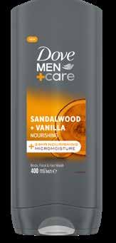 Dove Men+Care Sandalwood + Vanilla dušigeel ühendab keha, näo ja juuste dušigeeli eelised täiustatud Micromoisture’i tehnoloogiaga, mis tagab optimaalse niisutuse ja kaitse kuivuse eest. Iga kasutuskorraga osaleb Micromoisture’i tehnoloogia aktiivselt puhastusprotsessis, aidates säilitada naha loomulikku niiskust. Tulemuseks on sügavalt niisutatud ja taaselustatud nahk. Soe sandlipuu ja vanilli lõhn ergutab meeli ning annab energiat terveks päevaks. Saadaval kõigis hästi varustatud kauplustes.