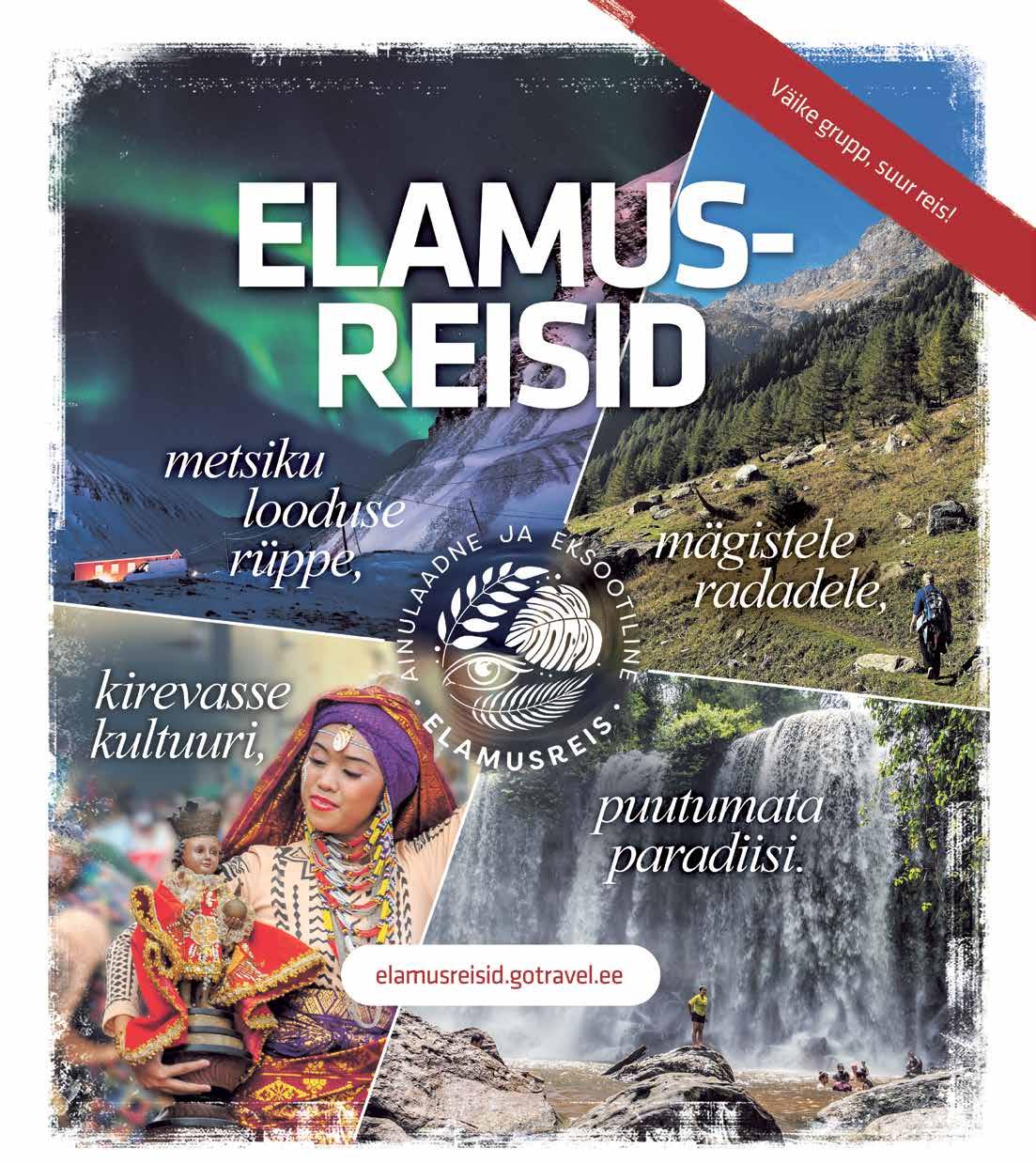 UUS! 20.03–04.04 Ehe Vietnam – kultuuri- ja loodusreis. (2 kohta) 3083 € UUS! 28.03–04.04 Malta Gozo ja Comino loodusreis ning lihavõtterongkäik. 1655 € 13.–28.04 Nepal – kultuur, loodus, külad. Kultuurireis ilma matkamiseta! 3584 € 26.06–04.07 ja 04.–12.09 Albaania ringreis. 1626 € 07.–15.07 ja 07.–15.09 Armeenia ringreis. 1653 €