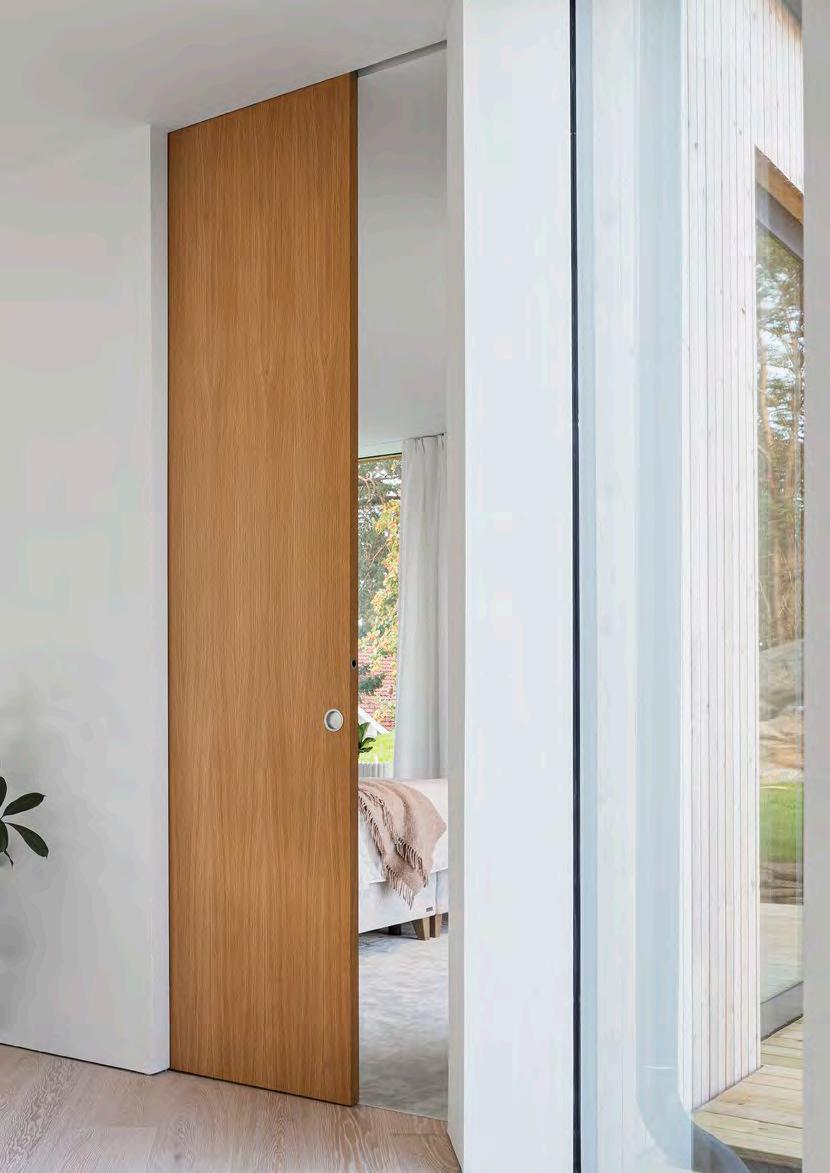 Skjutdörrar sparar plats och skapar en modern känsla i rummet. Alla Ekstrands innerdörrar kan levereras som skjutdörr och vi erbjuder flera olika tekniska lösningar.