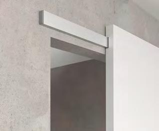 Skjutdörrslösning med skena i dörrblad för montering i tak. Skjutdörrsystem med minimal inbyggnadshöjd. Kan fällas in i vägg eller vara utanpåliggande. Mellanrummet mellan dörrblad och skena kan vara så pass litet som 1-3 mm.