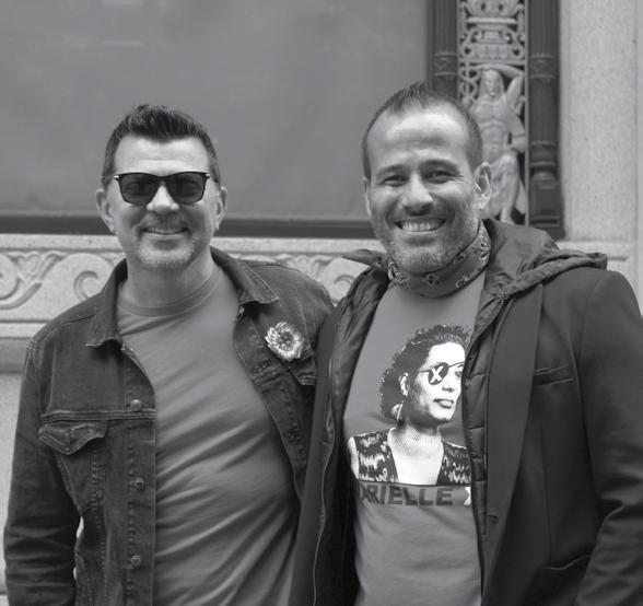 Lalo, 56, and Zé, 50, have been ma rried 27 years. For 25 of those years, they’ve lived together in San Francis co’s Castro District. Both wear red, the color of the PT (Workers Party/ Lula), and Zé (right) wears a shirt in memory of Marielle Franco, a Bra zilian feminist, socialist, bisexual Black woman city councilor who was assassinated in 2018. Lalo, 56, e Zé, 50, estão casados há 27 anos. Duran te 25 desses anos, eles viveram juntos no Distrito Castro em São Francisco. Ambos usam vermelho, a cor do PT, e Zé (à direita) veste uma camiseta em homenagem a Marielle Franco, femi nista, socialista, bisexual, negra e ve readora assassinada no RJ em 2018.